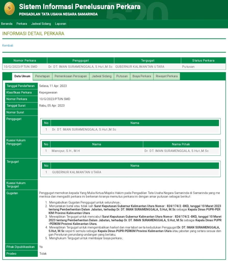 Dilihat dari laman sipp.ptun-samarinda.go.id, Rabu 12 Juli 2023, putusan PTUN Samarinda telah resmi keluar, yang isinya mengabulkan keseluruhan gugatan Datu Iman sebagai pihak penggugat.