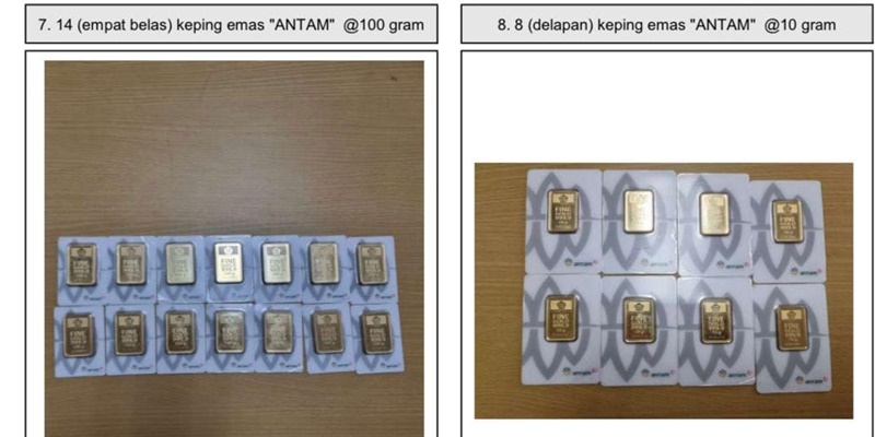 Selanjutnya, 10 keping emas Antam bersertifikat masing-masing 100 gram, satu keping emas 25 gram bersertifikat Antam, 14 keping emas masing-masing 100 gram dengan sertifikat Antam, 8 keping emas masing-masing 10 gram dengan sertifikat Antam, satu keping emas 5 gram dengan sertifikat Antam, dan satu keping emas 2 gram dengan sertifikat Antam.