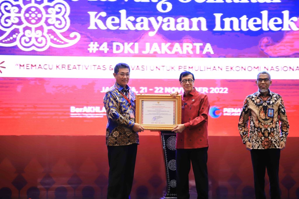 Penghargaan ini diserahkan oleh Menkumham Yasonna Laoly dan diterima oleh Wakil Gubernur Kaltara Yansen TP dalam kegiatan Roving Seminar Kekayan Intelektual (KI) yang diselenggarakan di Birawa Assembly Hall, Senin (21/11).